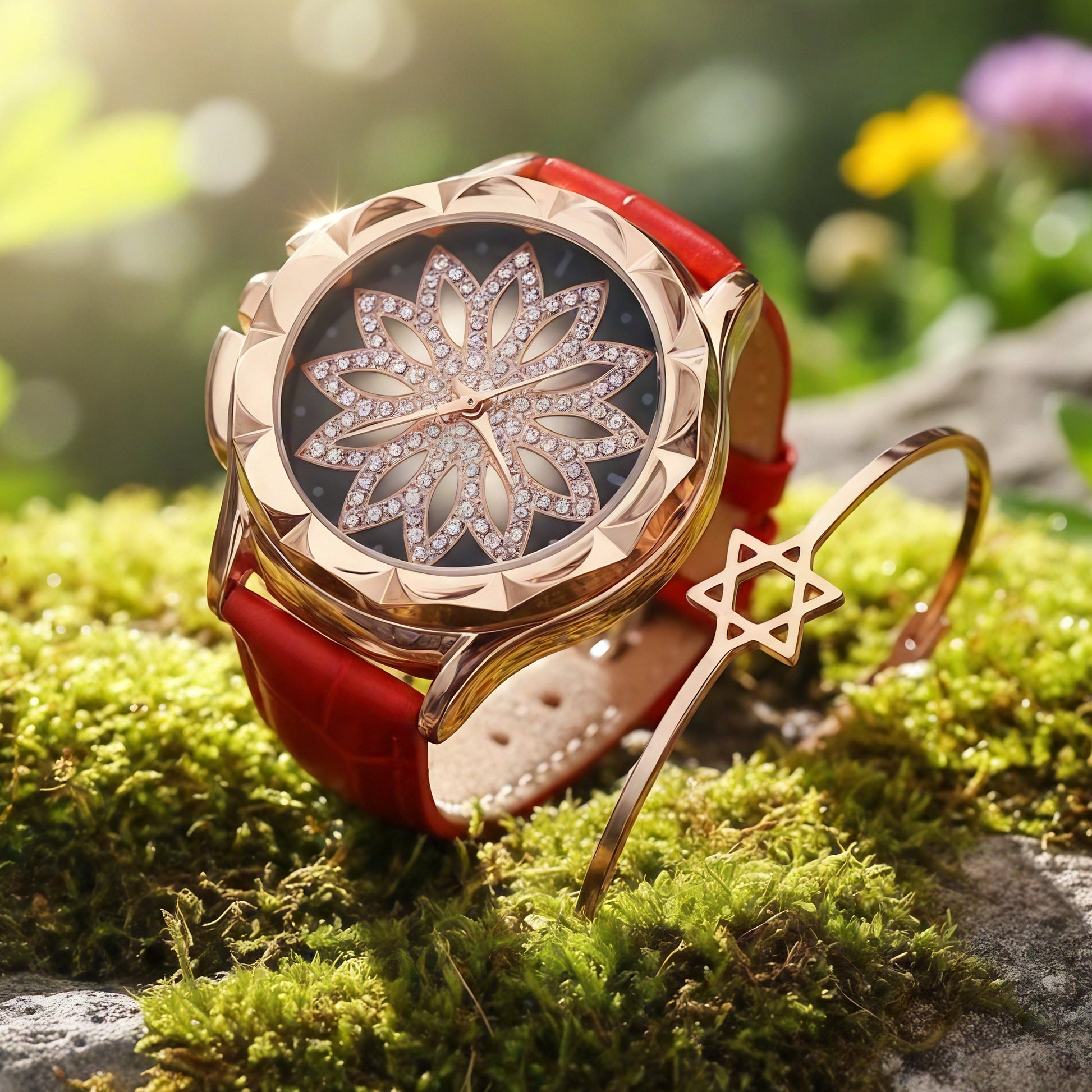The Elegant Rotating Lotus Dial Leather Watch combines timeless style with a unique rotating lotus design, making it the perfect accessory for women who love fashion with a touch of artistry. Its striking floral motif, detailed with sparkling accents, captures attention instantly, offering an air of sophistication and elegance.